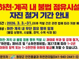 청양군이 하천의 공공 기능을 정상화하고 여름철 집중호우에 따른 재해를 사전에 방지하기 위해 3월부터 오는 9월까지 ‘하천 불법 점유 행위 일제 정비’를 추진한다고 밝혔다.이번 정비는 정부의 하천 불