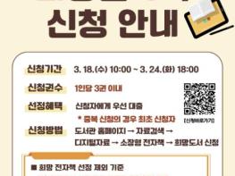 용인특례시는 오는 3월 18일부터 24일까지 상반기 전자책 희망 도서 신청을 받는다고 16일 밝혔다.희망 도서 신청은 시 도서관 정회원이라면 누구나 가능하다.소장형 전자책 누리집 ‘희망 도서’ 메뉴에서