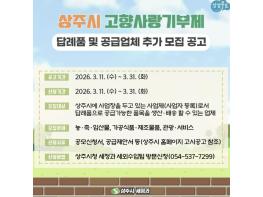 상주시는 고향사랑기부제 활성화와 지역경제 발전을 위해 고향사랑기부제 답례품 및 공급업체를 추가 모집한다.이번 추가 모집은 지역의 우수한 특산품과 다양한 상품을 발굴해 기부자에게 제공하고, 지역