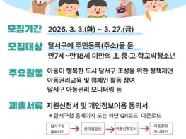 대구 달서구는 아동 정책에 대한 의견을 제시하고 아동권리 증진 활동에 참여할‘아동친화모니터단 4기’단원을 오는 27일까지 모집한다. 달서구 아동친화모니터단은 아동이 행복한‘아동친화도시 달서구’