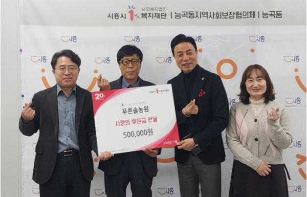 시흥시 능곡동 행정복지센터는 지난 11월 14일 푸른솔농원으로부터 관내 어려운 이웃을 위한 후원금 50만 원을 기탁받았다.