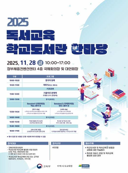 먼저 ‘기울어진 문해력’의 저자인 한양대학교 조병영 교수가 ‘인공지능(AI) 시대, 학생 문해력 향상을 위한 독서교육 방향’에 대하여 강연할 예정이다. 이어서 국제회의장에서는 교육부가 2025년에 추진한 관련 연구 결과 공유와 독서교육 선도학교 운영 성과 보고, 교과 연계 독서교육 강화 전략을 주제로 한 공개 토론회(포럼)가 운영된다. 동시에 대연회장에서는 독서교육 실천 사례와 우수 프로그램 공유, 디지털 시대에 대응하는 사서 교사의 역할을 주제로 이야기 공연(토크 콘서트)이 진행된다.