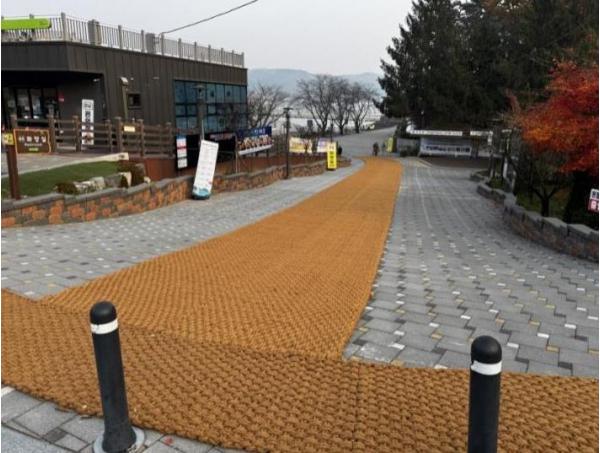 군은 동절기 낙상사고를 예방하기 위해 미끄럼 주의 현수막을 설치하고, 주요 이동로 중심으로 보행매트(야자매트)를 설치 완료했다.