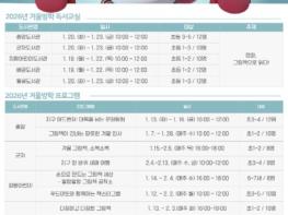겨울방학 프로그램은 아동 및 초등학생을 대상으로 12개의 프로그램이 운영된다. '지구 어드벤처: 대륙을 넘는 문화탐험', '그림책이 건네는 따뜻한 겨울 인사)'(중앙) ▲'겨울 그림책, 소복소복', '지구 한 바퀴 새해 여행'(군자) ▲'손으로 만드는 그림책 세상 말랑말랑 그림책 공작소', '푸드아트와 함께하는 책스타그램'(정왕어린이) ▲'다정하고 다정한 그림책', '함께 읽는 Froggy', '그림책전(傳)'(배곧) ▲'북딱뚝딱 꾸러기 북아트 교실', '두뇌 업! 수학보드게임'(월곶) 등으로 구성됐다.