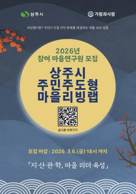상주시는 지방소멸 위기에 대응하고 주민이 주도하는 살기 좋은 마을 조성을 위해 녪년 상주시 주민주도형 마을리빙랩’참여자를 오는 3월 6일까지 모집한다.