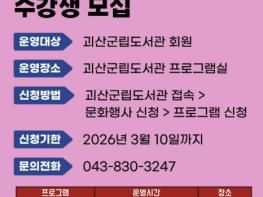 충북 괴산군립도서관은 2026년 상반기 독서문화 프로그램을 운영하고 오는 10일까지 누리집을 통해 수강생을 모집한다고 4일 밝혔다.