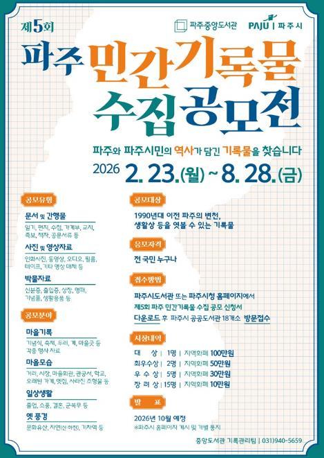 파주시 중앙도서관은 시민의 삶 속에 남아 있는 기록을 통해 지역의 역사를 되살리고자 2월 23일부터 8월 28일까지 ‘제5회 파주 민간기록물 수집 공모전’을 개최한다.