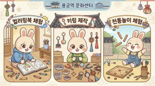 공간별 특색을 살린 체험 프로그램도 눈길을 끈다. 용궁역사 내에서는 오전 10시부터 오후 5시까지 창의력을 발휘할 수 있는 컬러링북 및 키링 만들기 체험이 상시 운영되며, 야외 테마공원에서는 투호, 제기차기, 고리 던지기 등 전 세대가 함께 즐길 수 있는 전통 놀이 체험 공간이 마련돼 활기찬 분위기를 더할 예정이다.