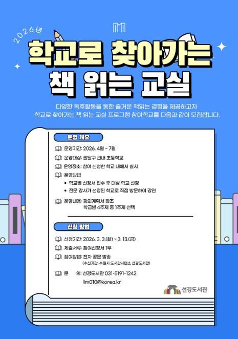 수원시 선경도서관은 ‘2026년 학교로 찾아가는 책 읽는 교실’에 참여할 팔달구 관내 초등학교를 13일까지 모집한다.