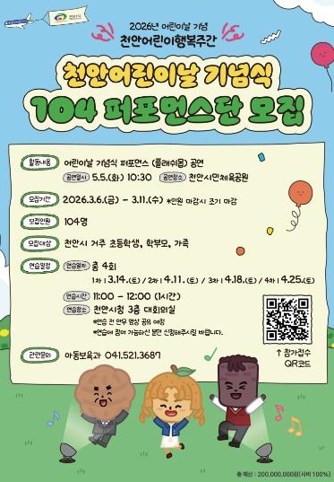 천안시는 제104회 어린이날을 맞아 기념식 무대를 함께 꾸밀 ‘104 퍼포먼스단’을 모집한다고 6일 밝혔다.