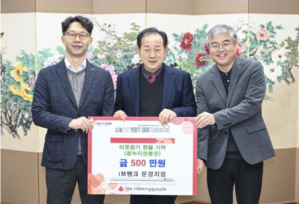 지난 5일 iM뱅크 문경지점(지점장 이영우)은 지역사회 나눔 실천을 위해 문경시에 온누리상품권 500만 원을 기탁했다.