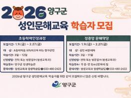 양구군이 배움의 기회를 놓친 성인 학습자들의 기초학력 향상과 평생학습 참여 확대를 위해 ‘2026년 성인문해교육 운영 사업’을 오는 3월 9일 개강한다.