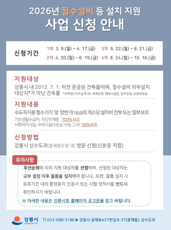 강릉시는 지속되는 기상이변과 장기 갈수기(가뭄 때)로 원수 확보가 어려워짐에 따라, 시민들이 수돗물을 절약하고 효율적으로 사용할 수 있도록 ‘2026년 절수설비 등 설치 지원사업’을 추진한다.