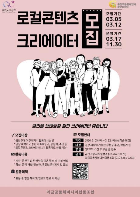 금천구는 12일까지 지역의 다양한 이야기를 영상 콘텐츠로 제작할 ‘2026 로컬콘텐츠 크리에이터’를 모집한다고 밝혔다.