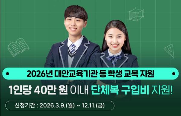 경기도는 시군과 협력해 교복, 체육복 등 단체복 구입비 최대 40만 원을 지원한다. 지원 대상은 입·전학일 기준 경기도에 주민등록을 둔 도 내·외 대안교육기관 중·고등학교 1학년 입학생과 다른 시도에 소재한 중·고등학교 1학년 입학생이다.