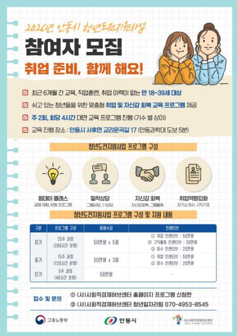 안동시는 취업 준비 과정에서 어려움을 겪거나 구직 활동을 중단한 청년들을 돕기 위한 ‘청년도전지원사업’의 참여자를 모집한다.