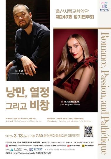 울산시립교향악단은 오는 3월 13일 오후 7시 30분 울산문화예술회관 대공연장에서 ‘낭만, 열정, 그리고 비창’을 주제로 제249회 정기연주회를 개최한다고 밝혔다.