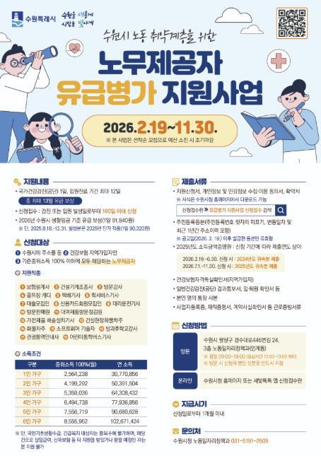 수원시는 11월 30일까지 ‘2026년 노동취약계층 노무 제공자 유급병가 지원사업’ 신청을 받는다.