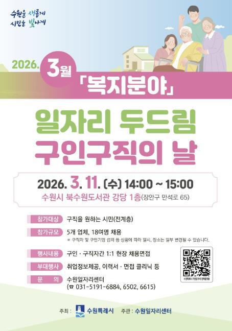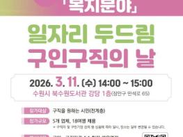 수원특례시는 3월 11일 오후 2시부터 3시까지 북수원도서관 강당에서 ‘3월 일자리 두드림 구인·구직의 날’을 개최한다.