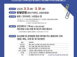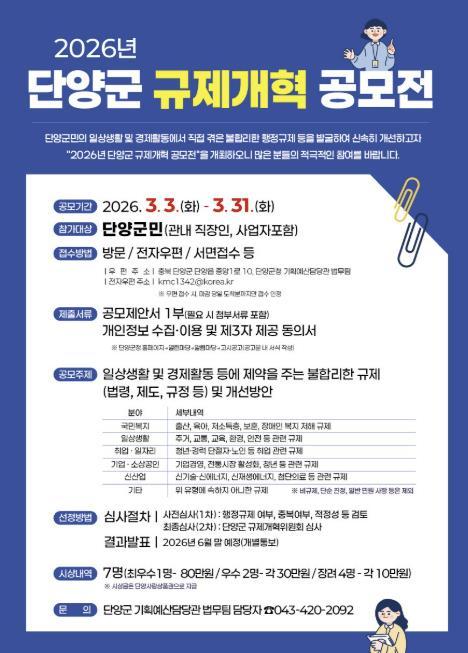 단양군이 군민의 일상생활과 경제활동에서 체감하는 불합리한 행정규제를 발굴하고 개선하기 위해 ‘2026년 단양군 규제개혁 공모전’을 개최한다.