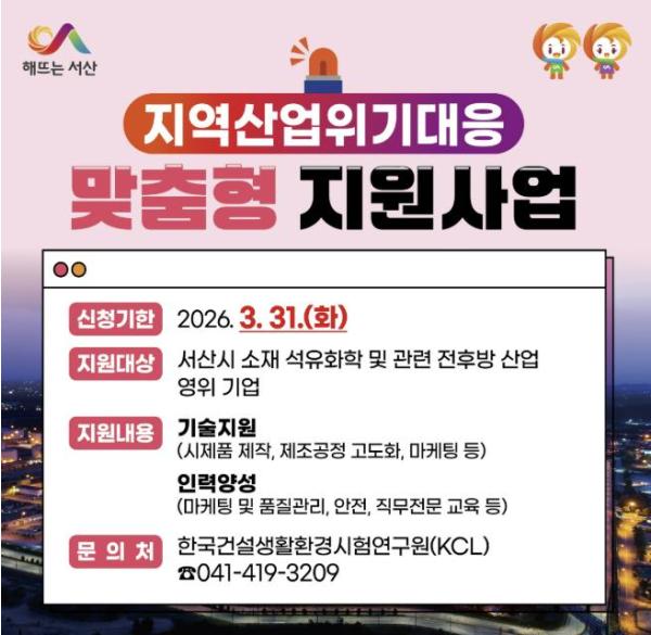 충남 서산시가 석유화학 산업의 위기 극복과 지역경제 활성화를 위해 ‘2026년 지역산업위기 대응 맞춤형 지원사업’을 본격 추진한다고 밝혔다.