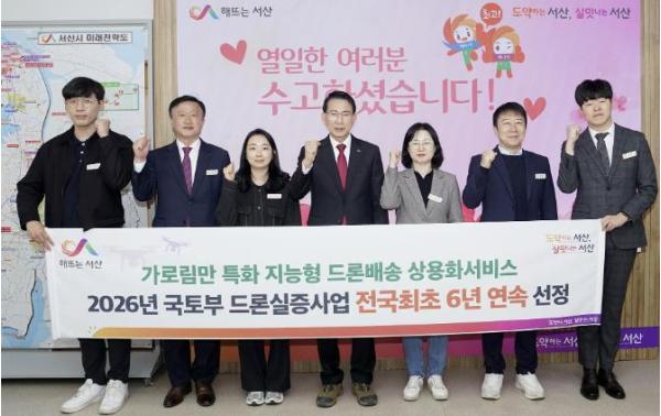 충남 서산시는 국토교통부와 항공안전기술원이 주관하는 2026년 드론 실증도시 구축사업 공모에 전국 최초로 6년 연속 선정됐다고 밝혔다.