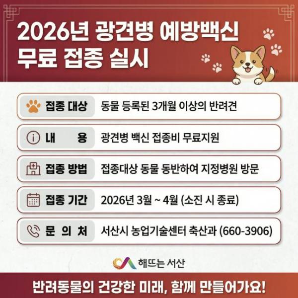 충남 서산시는 관내 반려견을 대상으로 광견병 예방백신 무료 접종을 지원한다고 밝혔다.