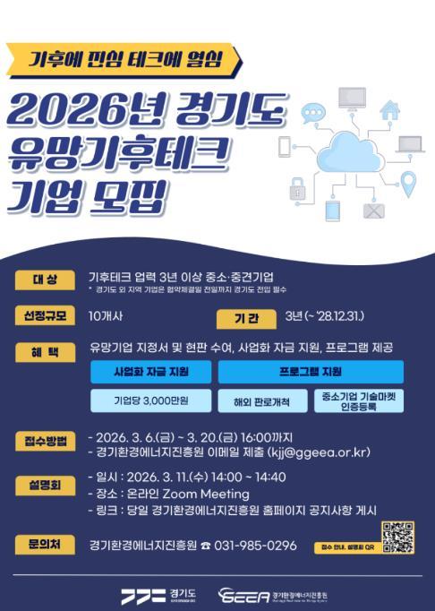 경기도와 경기환경에너지진흥원이 기후위기 대응을 선도할 혁신 기술 보유 기업을 발굴하기 위해 오는 3월 20일까지 ‘2026년 경기도 유망 기후테크 기업’ 10곳을 모집한다.