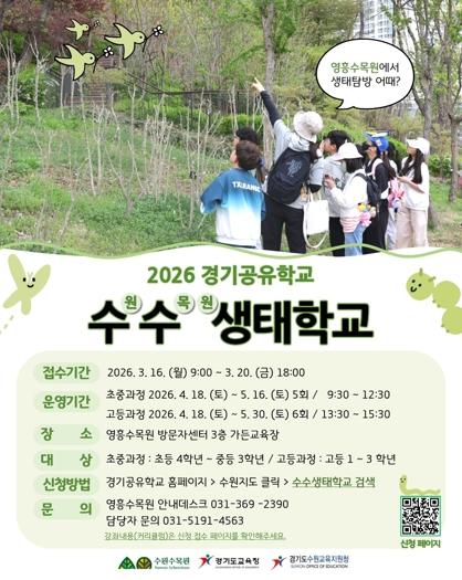 관내 초등학교 4학년부터 고등학교 3학년까지 학생이 참여할 수 있다. 무료 교육이다. 참여 신청은 3월 16일 오전 9시부터 3월 20일 오후 6시까지 경기공유학교 홈페이지에서 ‘수원시’를 선택한 뒤 ‘수수생태학교’를 검색해서 할 수 있다.