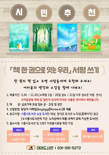 시흥시 대야도서관은 시민 독서 문화 확산과 지역사회 독서공동체 활성화를 위해 3월 20일부터 11월 20일까지 서평 쓰기를 운영하는 가운데 시민들의 서평을 받는다.