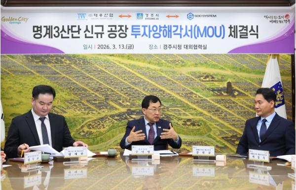 경주시는 ㈜태웅산업, ㈜수시스템과 내남면 명계3일반산업단지 내 공장 신설 및 본사 이전을 위한 투자양해각서(MOU)를 체결했다고 15일 밝혔다.