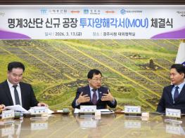 지난 13일 시청 내 대외협력실에서 열린 협약식에는 주낙영 경주시장을 비롯해 김필규 ㈜태웅산업 대표이사, 방예현 ㈜수시스템 대표이사 등 기업 관계자들이 참석했다. 이번 협약에 따라 두 기업은 명계3산업단지 동일 부지 내 필지를 분할 활용해 신규 공장을 건립할 계획이다.