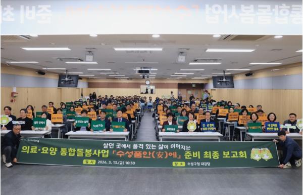 대구 수성구는 지난 13일 구청 대강당에서 이달 27일 시행 예정인 의료·요양 통합돌봄 사업 '수성품안(安)에'의 준비 상황을 점검하고 민관 협력체계를 강화하기 위한 ‘'수성품안(安)에' 준비 최종 보고회’를 개최했다.