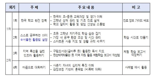 이번 교육은 한국어 소통이 가능한 학부모 소규모 그룹을 형성해 온·오프라인 방식을 병행하여 운영한다.