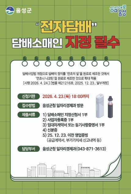 음성군은 개정 '담배사업법' 시행(2026년 4월 24일)을 앞두고, 합성 니코틴 전자담배를 포함한 모든 전자담배 제품이 법령상 ‘담배’에 포함되는 내용과 법 시행일 전 담배소매인 지정을 신청할 것을 집중 홍보하고 있다.