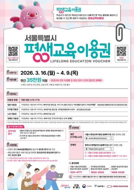 조성명 강남구청장은 “평생교육이용권은 경제적 여건이나 신체적 제약 때문에 배움의 기회를 놓치기 쉬운 구민들에게 다시 학습의 문을 열어주는 제도”라며 “구민 한 분 한 분이 자신의 삶에 필요한 배움을 이어가고, 그 배움이 일상과 일자리, 미래의 가능성으로 이어질 수 있도록 촘촘한 평생학습 지원을 계속해 나가겠다”고 말했다.