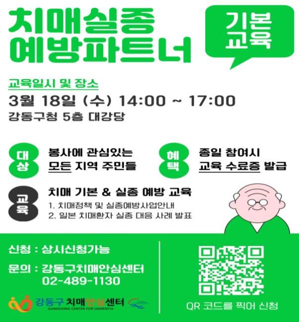이를 위해 오는 3월 18일 오후 2시 강동구청 5층 대강당에서 지역사회 치매실종예방 파트너 양성을 위한 기본교육을 진행한다. 교육에 참여한 지역 주민에게는 치매실종예방 파트너 수료증을 수여한다.