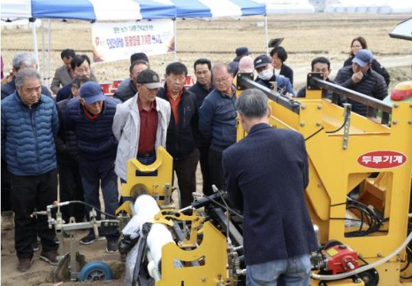 군은 지난 16일 태안읍 상옥리 소재 농가에서 관내 마늘 재배 농업인과 군 관계자 등 100여 명이 참석한 가운데 ‘태안마늘 일괄 파종 기계화 연시회’를 개최하고, 기계 작동 원리와 운용 방법 설명 및 현장 시연을 통해 참석자들의 이해를 도왔다.