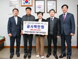 부여군산림조합 건설기계작업단은 지난 16일 산림조합 임원진들과 부여군청을 방문하여 지역인재 육성을 위한 장학금 4백만 원을 (재)부여군굿뜨래장학회에 기탁했다.
