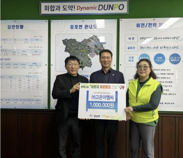 ㈜고은이엠씨는 지난 17일 아산시 둔포면 행복키움추진단을 찾아 어려운 이웃을 위한 후원금 100만 원을 전달했다.
