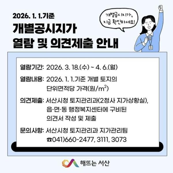 개별공시지가는 3월 18일부터 4월 6일까지 서산시 토지관리과(2청사 지가상황실), 읍면동 행정복지센터, 부동산공시가격알리미 누리집에서 열람할 수 있다.