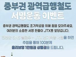 충북 진천군이 ‘중부권 광역급행철도(JTX)’ 조기 착공을 위한 군민과 국민의 관심을 모으기 위해 오는 3월 29일까지 SNS 서명운동 참여 이벤트를 진행한다.
