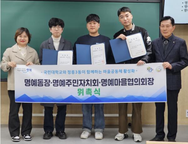 서울 성북구 정릉3동주민센터가 지난 3월 17일 사랑교회에서 제9기 명예단체장 위촉식을 열고 국민대학교 학생 3명을 명예동장, 명예주민자치회장, 명예마을협의회장으로 각각 위촉했다.