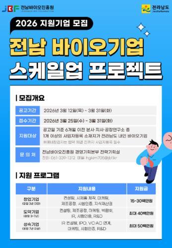 전라남도가 2026년 신규사업으로 ‘전남 바이오기업 스케일업 프로젝트’를 본격 가동하고, 참여기업 모집에 나섰다.