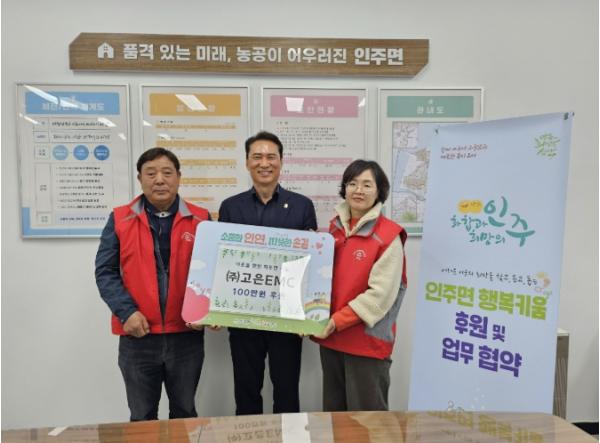 아산시 인주면 행복키움추진단은 지난 19일 ㈜고은EMC로부터 저소득층 지원을 위한 후원금 100만 원을 전달받았다.