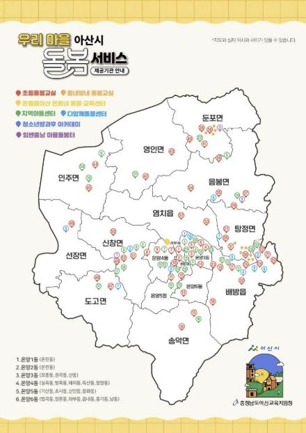 영유아 돌봄은 권역별 ‘365×24 어린이집’을 중심으로 운영된다. 생후 6개월부터 취학 전까지를 대상으로 평일 야간과 새벽, 주말 및 공휴일에도 보육 서비스를 제공한다. 이용료는 시간당 2,000원이다. 현재 배방읍과 온양3동 등 2개소가 운영 중이며, 상반기 중 음봉면과 둔포면에 2개소가 추가로 문을 열 예정이다.