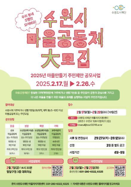 참여를 원하는 공동체는 2월 17일부터 26일까지 수원도시재단 마을자치지원센터를 방문하거나 전자우편으로 신청하면 된다.