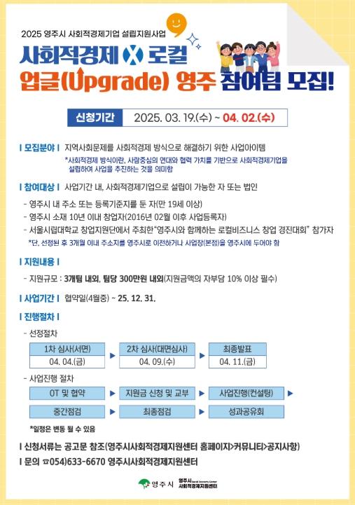 영주시와 영주시사회적경제지원센터는 ‘사회적경제 X 로컬 업글(Upgrade) 영주’ 참여팀을 오는 4월 2일까지 모집한다고 밝혔다.