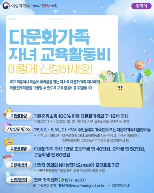 다문화가족 자녀 교육활동비는 아동·청소년의 진로 역량 강화를 위해 NH농협카드(채움) 포인트로 지급되며, 지원 금액은 연 1회 초등학생 40만 원, 중학생 50만 원, 고등학생 60만 원이다. 지원금은 서점, 학원, 독서실 이용, 교재 구매 등 교육 목적으로 사용할 수 있으며, 사용 기한은 11월 30일까지다. 기한 내 사용하지 않은 포인트는 자동 소멸된다.