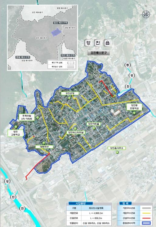정비 대상지는 강진읍 강진배수분구(서성리, 남성리, 동성리, 평동리) 일원이며, 총사업비 360억 원(국비 216억 원)을 투입해, 우수관로 신설 및 개량 5.73km와 빗물받이 778개소(기존 개량 389개소, 신설 389개소)를 정비할 계획이다.